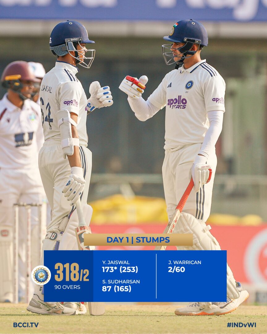 ఢిల్లీలోని అరుణ్ జైట్లీ మైదానం వేదికగా భారత్- వెస్టిండీస్ మధ్య జరుగుతున్న రెండో టెస్టులో తొలి రోజు ఆట ముగిసింది. టాస్ గెలిచి బ్యాటింగ్ ఎంచుకున్న టీమ్ఇండియా.. ఆట ముగిసే సమయానికి 2 వికెట్లు కోల్పోయి 318 పరుగులు చేసింది. ఓపెనర్ యశస్వి జైస్వాల్ (173*) డబుల్ సెంచరీకి చేరువలో ఉన్నాడు. సాయి సుదర్శన్ (87) అర్ధశతకంతో రాణించాడు. కేఎల్ రాహుల్ (38) రాణించాడు. కెప్టెన్ శుభ్మన్ గిల్ (20*) క్రీజులో కొనసాగుతున్నాడు. రెండు వికెట్లూ జోమెల్ కే దక్కాయి.